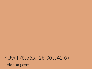 YUV 176.565,-26.901,41.6 Color is a light orange color and the nearest color is Tumbleweed #dea681. Hex code #e0a37a and RGB value is rgb(224,163,122). In RGB color space, this color is composed of 88% red, 64% green, 48% blue, In CMYK color space, this color is composed of 0% cyan, 27% magenta, 46% yellow , 12% black , In HSL color space, this color has a hue angle of 24° , 62% saturation and 68% lightness.