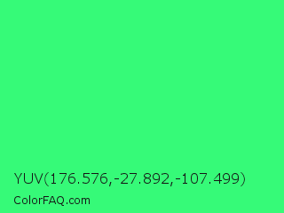 YUV 176.576,-27.892,-107.499 Color is a normal green color and the nearest color is UFO Green #3cd070. Hex code #36fa78 and RGB value is rgb(54,250,120). In RGB color space, this color is composed of 21% red, 98% green, 47% blue, In CMYK color space, this color is composed of 78% cyan, 0% magenta, 52% yellow , 2% black , In HSL color space, this color has a hue angle of 140° , 95% saturation and 60% lightness.
