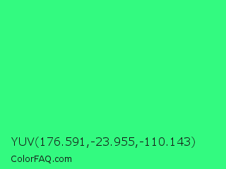 YUV 176.591,-23.955,-110.143 Color is a normal green color and the nearest color is UFO Green #3cd070. Hex code #33fa80 and RGB value is rgb(51,250,128). In RGB color space, this color is composed of 20% red, 98% green, 50% blue, In CMYK color space, this color is composed of 80% cyan, 0% magenta, 49% yellow , 2% black , In HSL color space, this color has a hue angle of 143° , 95% saturation and 59% lightness.