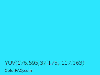 YUV 176.595,37.175,-117.163 Color is a normal cyan color and the nearest color is Loeen #15f2fd. Hex code #2be6fc and RGB value is rgb(43,230,252). In RGB color space, this color is composed of 17% red, 90% green, 99% blue, In CMYK color space, this color is composed of 83% cyan, 9% magenta, 0% yellow , 1% black , In HSL color space, this color has a hue angle of 186° , 97% saturation and 58% lightness.