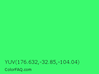 YUV 176.632,-32.85,-104.04 Color is a normal green color and the nearest color is UFO Green #3cd070. Hex code #3afa6e and RGB value is rgb(58,250,110). In RGB color space, this color is composed of 23% red, 98% green, 43% blue, In CMYK color space, this color is composed of 77% cyan, 0% magenta, 56% yellow , 2% black , In HSL color space, this color has a hue angle of 136° , 95% saturation and 60% lightness.