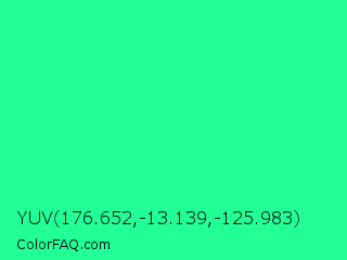 YUV 176.652,-13.139,-125.983 Color is a normal green color and the nearest color is Medium Spring Green #00fa9a. Hex code #21ff96 and RGB value is rgb(33,255,150). In RGB color space, this color is composed of 13% red, 100% green, 59% blue, In CMYK color space, this color is composed of 87% cyan, 0% magenta, 41% yellow , 0% black , In HSL color space, this color has a hue angle of 152° , 100% saturation and 56% lightness.