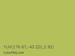 YUV 176.67,-43.221,2.92 Color is a normal yellow color and the nearest color is Celery #b8c25d. Hex code #b4c059 and RGB value is rgb(180,192,89). In RGB color space, this color is composed of 71% red, 75% green, 35% blue, In CMYK color space, this color is composed of 6% cyan, 0% magenta, 54% yellow , 25% black , In HSL color space, this color has a hue angle of 67° , 45% saturation and 55% lightness.