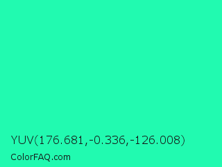 YUV 176.681,-0.336,-126.008 Color is a normal green color and the nearest color is Medium Spring Green #00fa9a. Hex code #21fab0 and RGB value is rgb(33,250,176). In RGB color space, this color is composed of 13% red, 98% green, 69% blue, In CMYK color space, this color is composed of 87% cyan, 0% magenta, 30% yellow , 2% black , In HSL color space, this color has a hue angle of 160° , 96% saturation and 55% lightness.
