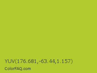 YUV 176.681,-63.44,1.157 Color is a normal yellow color and the nearest color is Android Green #a4c639. Hex code #b2c930 and RGB value is rgb(178,201,48). In RGB color space, this color is composed of 70% red, 79% green, 19% blue, In CMYK color space, this color is composed of 11% cyan, 0% magenta, 76% yellow , 21% black , In HSL color space, this color has a hue angle of 69° , 61% saturation and 49% lightness.