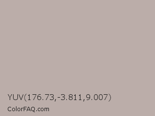YUV 176.73,-3.811,9.007 Color is a light red color and the nearest color is Silk #bdb1a8. Hex code #bbada9 and RGB value is rgb(187,173,169). In RGB color space, this color is composed of 73% red, 68% green, 66% blue, In CMYK color space, this color is composed of 0% cyan, 7% magenta, 10% yellow , 27% black , In HSL color space, this color has a hue angle of 13° , 12% saturation and 70% lightness.