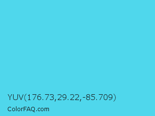 YUV 176.73,29.22,-85.709 Color is a light cyan color and the nearest color is Viking #64ccdb. Hex code #4fd7ec and RGB value is rgb(79,215,236). In RGB color space, this color is composed of 31% red, 84% green, 93% blue, In CMYK color space, this color is composed of 67% cyan, 9% magenta, 0% yellow , 7% black , In HSL color space, this color has a hue angle of 188° , 81% saturation and 62% lightness.