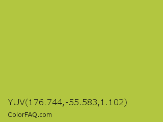 YUV 176.744,-55.583,1.102 Color is a normal yellow color and the nearest color is Android Green #a4c639. Hex code #b2c640 and RGB value is rgb(178,198,64). In RGB color space, this color is composed of 70% red, 78% green, 25% blue, In CMYK color space, this color is composed of 10% cyan, 0% magenta, 68% yellow , 22% black , In HSL color space, this color has a hue angle of 69° , 54% saturation and 51% lightness.