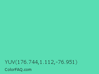 YUV 176.744,1.112,-76.951 Color is a light green color and the nearest color is Medium Aquamarine #66ddaa. Hex code #59ddb3 and RGB value is rgb(89,221,179). In RGB color space, this color is composed of 35% red, 87% green, 70% blue, In CMYK color space, this color is composed of 60% cyan, 0% magenta, 19% yellow , 13% black , In HSL color space, this color has a hue angle of 161° , 66% saturation and 61% lightness.