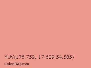 YUV 176.759,-17.629,54.585 Color is a light red color and the nearest color is Tonys Pink #e79f8c. Hex code #ef988d and RGB value is rgb(239,152,141). In RGB color space, this color is composed of 94% red, 60% green, 55% blue, In CMYK color space, this color is composed of 0% cyan, 36% magenta, 41% yellow , 6% black , In HSL color space, this color has a hue angle of 7° , 75% saturation and 75% lightness.