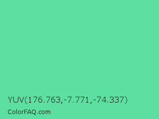 YUV 176.763,-7.771,-74.337 Color is a light green color and the nearest color is Medium Aquamarine #66ddaa. Hex code #5cdfa1 and RGB value is rgb(92,223,161). In RGB color space, this color is composed of 36% red, 87% green, 63% blue, In CMYK color space, this color is composed of 59% cyan, 0% magenta, 28% yellow , 13% black , In HSL color space, this color has a hue angle of 152° , 67% saturation and 62% lightness.