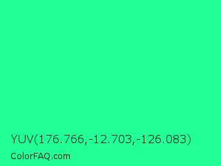 YUV 176.766,-12.703,-126.083 Color is a normal green color and the nearest color is Medium Spring Green #00fa9a. Hex code #21ff97 and RGB value is rgb(33,255,151). In RGB color space, this color is composed of 13% red, 100% green, 59% blue, In CMYK color space, this color is composed of 87% cyan, 0% magenta, 41% yellow , 0% black , In HSL color space, this color has a hue angle of 152° , 100% saturation and 56% lightness.