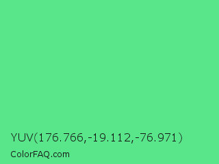 YUV 176.766,-19.112,-76.971 Color is a light green color and the nearest color is Very Light Malachite Green #64e986. Hex code #59e58a and RGB value is rgb(89,229,138). In RGB color space, this color is composed of 35% red, 90% green, 54% blue, In CMYK color space, this color is composed of 61% cyan, 0% magenta, 40% yellow , 10% black , In HSL color space, this color has a hue angle of 141° , 73% saturation and 62% lightness.