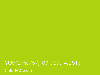 YUV 176.767,-80.737,-4.181 Color is a normal lime color and the nearest color is Vivid Lime Green #a6d608. Hex code #acd30d and RGB value is rgb(172,211,13). In RGB color space, this color is composed of 67% red, 83% green, 5% blue, In CMYK color space, this color is composed of 18% cyan, 0% magenta, 94% yellow , 17% black , In HSL color space, this color has a hue angle of 72° , 88% saturation and 44% lightness.