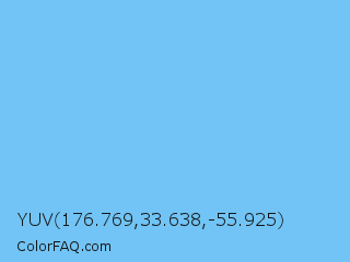 YUV 176.769,33.638,-55.925 Color is a light blue color and the nearest color is Maya Blue #73c2fb. Hex code #71c4f5 and RGB value is rgb(113,196,245). In RGB color space, this color is composed of 44% red, 77% green, 96% blue, In CMYK color space, this color is composed of 54% cyan, 20% magenta, 0% yellow , 4% black , In HSL color space, this color has a hue angle of 202° , 87% saturation and 70% lightness.