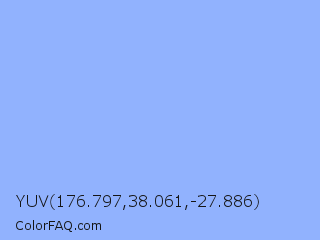 YUV 176.797,38.061,-27.886 Color is a light blue color and the nearest color is Jordy Blue #8ab9f1. Hex code #91b2fe and RGB value is rgb(145,178,254). In RGB color space, this color is composed of 57% red, 70% green, 100% blue, In CMYK color space, this color is composed of 43% cyan, 30% magenta, 0% yellow , 0% black , In HSL color space, this color has a hue angle of 222° , 98% saturation and 78% lightness.
