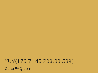 YUV 176.7,-45.208,33.589 Color is a normal orange color and the nearest color is Sunray #e3ab57. Hex code #d7af55 and RGB value is rgb(215,175,85). In RGB color space, this color is composed of 84% red, 69% green, 33% blue, In CMYK color space, this color is composed of 0% cyan, 19% magenta, 60% yellow , 16% black , In HSL color space, this color has a hue angle of 42° , 62% saturation and 59% lightness.