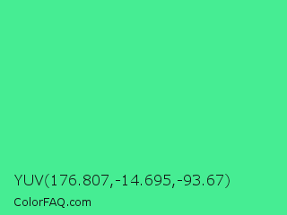 YUV 176.807,-14.695,-93.67 Color is a normal green color and the nearest color is Eucalyptus #44d7a8. Hex code #46ed93 and RGB value is rgb(70,237,147). In RGB color space, this color is composed of 27% red, 93% green, 58% blue, In CMYK color space, this color is composed of 70% cyan, 0% magenta, 38% yellow , 7% black , In HSL color space, this color has a hue angle of 148° , 82% saturation and 60% lightness.