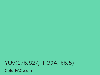 YUV 176.827,-1.394,-66.5 Color is a light green color and the nearest color is Medium Aquamarine #66ddaa. Hex code #65d8ae and RGB value is rgb(101,216,174). In RGB color space, this color is composed of 40% red, 85% green, 68% blue, In CMYK color space, this color is composed of 53% cyan, 0% magenta, 19% yellow , 15% black , In HSL color space, this color has a hue angle of 158° , 60% saturation and 62% lightness.