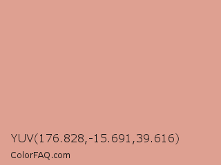 YUV 176.828,-15.691,39.616 Color is a light red color and the nearest color is Tonys Pink #e79f8c. Hex code #dea091 and RGB value is rgb(222,160,145). In RGB color space, this color is composed of 87% red, 63% green, 57% blue, In CMYK color space, this color is composed of 0% cyan, 28% magenta, 35% yellow , 13% black , In HSL color space, this color has a hue angle of 12° , 54% saturation and 72% lightness.
