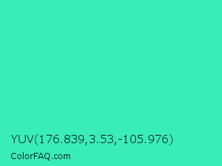 YUV 176.839,3.53,-105.976 Color is a normal green color and the nearest color is Turquoise #40e0d0. Hex code #38edb8 and RGB value is rgb(56,237,184). In RGB color space, this color is composed of 22% red, 93% green, 72% blue, In CMYK color space, this color is composed of 76% cyan, 0% magenta, 22% yellow , 7% black , In HSL color space, this color has a hue angle of 162° , 83% saturation and 57% lightness.