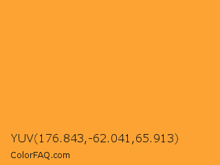 YUV 176.843,-62.041,65.913 Color is a normal orange color and the nearest color is Sunshade #ff9e2c. Hex code #fca333 and RGB value is rgb(252,163,51). In RGB color space, this color is composed of 99% red, 64% green, 20% blue, In CMYK color space, this color is composed of 0% cyan, 35% magenta, 80% yellow , 1% black , In HSL color space, this color has a hue angle of 33° , 97% saturation and 59% lightness.