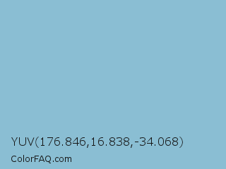 YUV 176.846,16.838,-34.068 Color is a light blue color and the nearest color is Dark Sky Blue #8cbed6. Hex code #8abed3 and RGB value is rgb(138,190,211). In RGB color space, this color is composed of 54% red, 75% green, 83% blue, In CMYK color space, this color is composed of 35% cyan, 10% magenta, 0% yellow , 17% black , In HSL color space, this color has a hue angle of 197° , 45% saturation and 68% lightness.