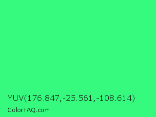 YUV 176.847,-25.561,-108.614 Color is a normal green color and the nearest color is UFO Green #3cd070. Hex code #35fa7d and RGB value is rgb(53,250,125). In RGB color space, this color is composed of 21% red, 98% green, 49% blue, In CMYK color space, this color is composed of 79% cyan, 0% magenta, 50% yellow , 2% black , In HSL color space, this color has a hue angle of 142° , 95% saturation and 59% lightness.