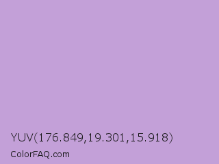 YUV 176.849,19.301,15.918 Color is a light purple color and the nearest color is Light Wisteria #c9a0dc. Hex code #c3a0d8 and RGB value is rgb(195,160,216). In RGB color space, this color is composed of 76% red, 63% green, 85% blue, In CMYK color space, this color is composed of 10% cyan, 26% magenta, 0% yellow , 15% black , In HSL color space, this color has a hue angle of 278° , 42% saturation and 74% lightness.