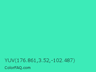 YUV 176.861,3.52,-102.487 Color is a normal green color and the nearest color is Turquoise #40e0d0. Hex code #3cebb8 and RGB value is rgb(60,235,184). In RGB color space, this color is composed of 24% red, 92% green, 72% blue, In CMYK color space, this color is composed of 74% cyan, 0% magenta, 22% yellow , 8% black , In HSL color space, this color has a hue angle of 163° , 81% saturation and 58% lightness.