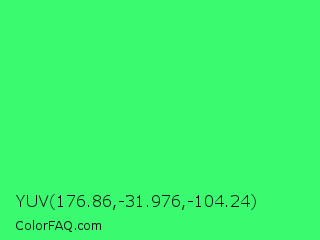 YUV 176.86,-31.976,-104.24 Color is a normal green color and the nearest color is UFO Green #3cd070. Hex code #3afa70 and RGB value is rgb(58,250,112). In RGB color space, this color is composed of 23% red, 98% green, 44% blue, In CMYK color space, this color is composed of 77% cyan, 0% magenta, 55% yellow , 2% black , In HSL color space, this color has a hue angle of 137° , 95% saturation and 60% lightness.