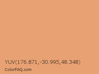 YUV 176.871,-30.995,48.348 Color is a light orange color and the nearest color is Fawn #e5aa70. Hex code #e8a172 and RGB value is rgb(232,161,114). In RGB color space, this color is composed of 91% red, 63% green, 45% blue, In CMYK color space, this color is composed of 0% cyan, 31% magenta, 51% yellow , 9% black , In HSL color space, this color has a hue angle of 24° , 72% saturation and 68% lightness.
