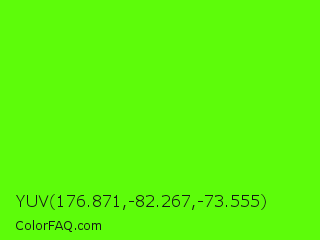 YUV 176.871,-82.267,-73.555 Color is a normal green color and the nearest color is Bright Green #66ff00. Hex code #5dfc0a and RGB value is rgb(93,252,10). In RGB color space, this color is composed of 36% red, 99% green, 4% blue, In CMYK color space, this color is composed of 63% cyan, 0% magenta, 96% yellow , 1% black , In HSL color space, this color has a hue angle of 99° , 98% saturation and 51% lightness.