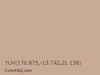 YUV 176.875,-13.742,21.158 Color is a light orange color and the nearest color is Indian Khaki #c3b091. Hex code #c9aa95 and RGB value is rgb(201,170,149). In RGB color space, this color is composed of 79% red, 67% green, 58% blue, In CMYK color space, this color is composed of 0% cyan, 15% magenta, 26% yellow , 21% black , In HSL color space, this color has a hue angle of 24° , 33% saturation and 69% lightness.