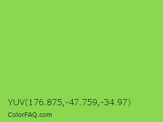 YUV 176.875,-47.759,-34.97 Color is a normal green color and the nearest color is Kiwi #8ee53f. Hex code #89d850 and RGB value is rgb(137,216,80). In RGB color space, this color is composed of 54% red, 85% green, 31% blue, In CMYK color space, this color is composed of 37% cyan, 0% magenta, 63% yellow , 15% black , In HSL color space, this color has a hue angle of 95° , 64% saturation and 58% lightness.