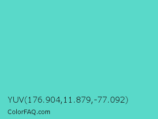 YUV 176.904,11.879,-77.092 Color is a normal cyan color and the nearest color is Medium Turquoise #48d1cc. Hex code #59d9c9 and RGB value is rgb(89,217,201). In RGB color space, this color is composed of 35% red, 85% green, 79% blue, In CMYK color space, this color is composed of 59% cyan, 0% magenta, 7% yellow , 15% black , In HSL color space, this color has a hue angle of 173° , 63% saturation and 60% lightness.