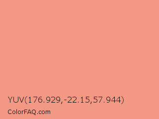 YUV 176.929,-22.15,57.944 Color is a light red color and the nearest color is Vivid Tangerine #ff9980. Hex code #f39884 and RGB value is rgb(243,152,132). In RGB color space, this color is composed of 95% red, 60% green, 52% blue, In CMYK color space, this color is composed of 0% cyan, 37% magenta, 46% yellow , 5% black , In HSL color space, this color has a hue angle of 11° , 82% saturation and 74% lightness.