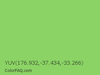 YUV 176.932,-37.434,-33.266 Color is a light green color and the nearest color is Pistachio #93c572. Hex code #8bd365 and RGB value is rgb(139,211,101). In RGB color space, this color is composed of 55% red, 83% green, 40% blue, In CMYK color space, this color is composed of 34% cyan, 0% magenta, 52% yellow , 17% black , In HSL color space, this color has a hue angle of 99° , 56% saturation and 61% lightness.