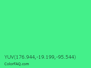 YUV 176.944,-19.199,-95.544 Color is a normal green color and the nearest color is Very Light Malachite Green #64e986. Hex code #44f08a and RGB value is rgb(68,240,138). In RGB color space, this color is composed of 27% red, 94% green, 54% blue, In CMYK color space, this color is composed of 72% cyan, 0% magenta, 43% yellow , 6% black , In HSL color space, this color has a hue angle of 144° , 85% saturation and 60% lightness.