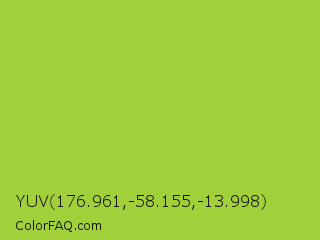 YUV 176.961,-58.155,-13.998 Color is a normal lime color and the nearest color is Android Green #a4c639. Hex code #a1d03b and RGB value is rgb(161,208,59). In RGB color space, this color is composed of 63% red, 82% green, 23% blue, In CMYK color space, this color is composed of 23% cyan, 0% magenta, 72% yellow , 18% black , In HSL color space, this color has a hue angle of 79° , 61% saturation and 52% lightness.