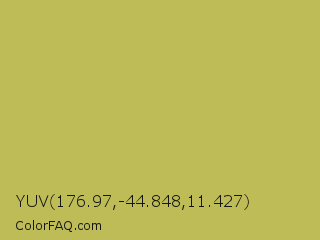 YUV 176.97,-44.848,11.427 Color is a normal yellow color and the nearest color is Celery #b8c25d. Hex code #bebc56 and RGB value is rgb(190,188,86). In RGB color space, this color is composed of 75% red, 74% green, 34% blue, In CMYK color space, this color is composed of 0% cyan, 1% magenta, 55% yellow , 25% black , In HSL color space, this color has a hue angle of 59° , 44% saturation and 54% lightness.
