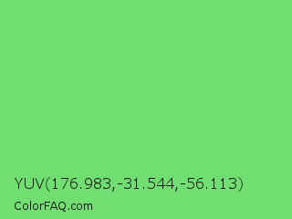 YUV 176.983,-31.544,-56.113 Color is a light green color and the nearest color is Pastel Green #77dd77. Hex code #71de71 and RGB value is rgb(113,222,113). In RGB color space, this color is composed of 44% red, 87% green, 44% blue, In CMYK color space, this color is composed of 49% cyan, 0% magenta, 49% yellow , 13% black , In HSL color space, this color has a hue angle of 120° , 62% saturation and 66% lightness.