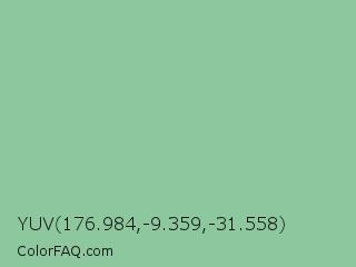 YUV 176.984,-9.359,-31.558 Color is a light green color and the nearest color is Eton Blue #96c8a2. Hex code #8dc79e and RGB value is rgb(141,199,158). In RGB color space, this color is composed of 55% red, 78% green, 62% blue, In CMYK color space, this color is composed of 29% cyan, 0% magenta, 21% yellow , 22% black , In HSL color space, this color has a hue angle of 138° , 34% saturation and 67% lightness.