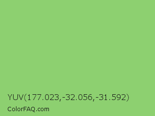 YUV 177.023,-32.056,-31.592 Color is a light green color and the nearest color is Pistachio #93c572. Hex code #8dd070 and RGB value is rgb(141,208,112). In RGB color space, this color is composed of 55% red, 82% green, 44% blue, In CMYK color space, this color is composed of 32% cyan, 0% magenta, 46% yellow , 18% black , In HSL color space, this color has a hue angle of 102° , 51% saturation and 63% lightness.