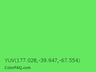 YUV 177.028,-39.947,-67.554 Color is a light green color and the nearest color is Screamin Green #66ff66. Hex code #64e860 and RGB value is rgb(100,232,96). In RGB color space, this color is composed of 39% red, 91% green, 38% blue, In CMYK color space, this color is composed of 57% cyan, 0% magenta, 59% yellow , 9% black , In HSL color space, this color has a hue angle of 118° , 75% saturation and 64% lightness.