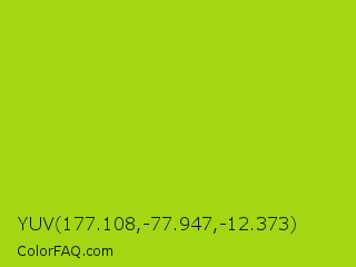YUV 177.108,-77.947,-12.373 Color is a normal lime color and the nearest color is Vivid Lime Green #a6d608. Hex code #a3d713 and RGB value is rgb(163,215,19). In RGB color space, this color is composed of 64% red, 84% green, 7% blue, In CMYK color space, this color is composed of 24% cyan, 0% magenta, 91% yellow , 16% black , In HSL color space, this color has a hue angle of 76° , 84% saturation and 46% lightness.