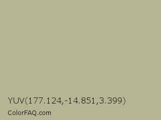 YUV 177.124,-14.851,3.399 Color is a light yellow color and the nearest color is Heathered Gray #b6b095. Hex code #b5b593 and RGB value is rgb(181,181,147). In RGB color space, this color is composed of 71% red, 71% green, 58% blue, In CMYK color space, this color is composed of 0% cyan, 0% magenta, 19% yellow , 29% black , In HSL color space, this color has a hue angle of 60° , 19% saturation and 64% lightness.