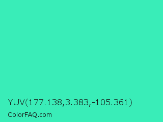 YUV 177.138,3.383,-105.361 Color is a normal green color and the nearest color is Turquoise #40e0d0. Hex code #39edb8 and RGB value is rgb(57,237,184). In RGB color space, this color is composed of 22% red, 93% green, 72% blue, In CMYK color space, this color is composed of 76% cyan, 0% magenta, 22% yellow , 7% black , In HSL color space, this color has a hue angle of 162° , 83% saturation and 58% lightness.