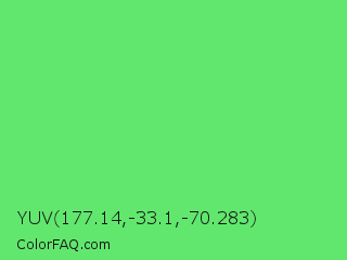 YUV 177.14,-33.1,-70.283 Color is a light green color and the nearest color is Very Light Malachite Green #64e986. Hex code #61e76e and RGB value is rgb(97,231,110). In RGB color space, this color is composed of 38% red, 91% green, 43% blue, In CMYK color space, this color is composed of 58% cyan, 0% magenta, 52% yellow , 9% black , In HSL color space, this color has a hue angle of 126° , 74% saturation and 64% lightness.