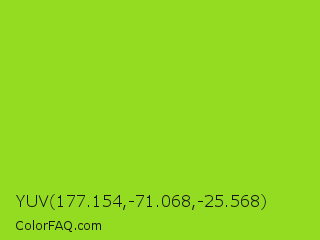 YUV 177.154,-71.068,-25.568 Color is a normal green color and the nearest color is Atlantis #97cd2d. Hex code #94dc21 and RGB value is rgb(148,220,33). In RGB color space, this color is composed of 58% red, 86% green, 13% blue, In CMYK color space, this color is composed of 33% cyan, 0% magenta, 85% yellow , 14% black , In HSL color space, this color has a hue angle of 83° , 74% saturation and 50% lightness.